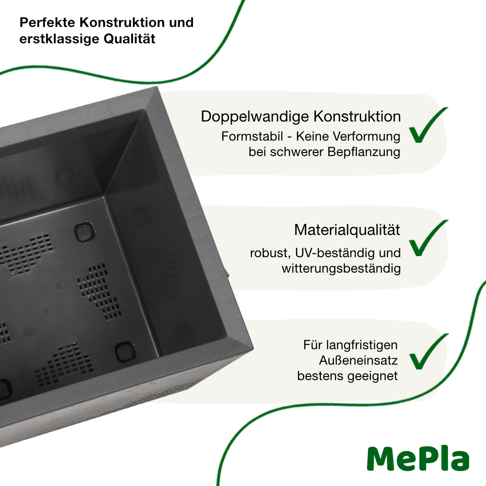 Entdecken Sie unsere hochwertigen Pflanzkübel mit integrierten, stabilen Rollen – ideal für müheloses Verschieben auch bei bepflanzten und schweren Kübeln. Die innovative doppelwandige Konstruktion sorgt für maximale Formstabilität: Kein Ausbeulen oder Verformen der Außenwände, selbst bei hoher Belastung. Der Hohlraum zwischen den Wänden dient gleichzeitig als praktischer Wasserspeicher und reduziert die Gießhäufigkeit.