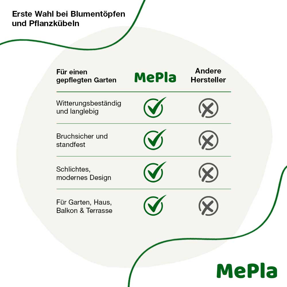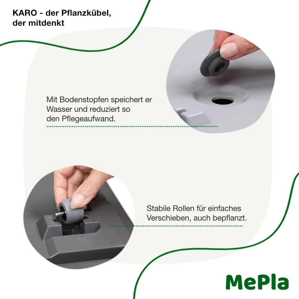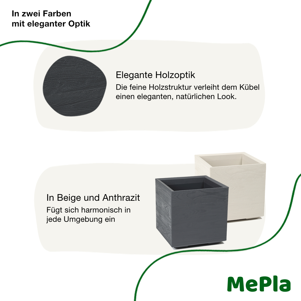 Dank integriertem Bodenstopfen sind die Kübel 100 % wasserdicht und perfekt für den Innenbereich geeignet (z. B. Wohnzimmer, Wintergarten oder Büro). Für den Außeneinsatz auf Terrasse oder Balkon einfach den Stopfen entfernen – überschüssiges Regenwasser läuft kontrolliert ab und schützt Ihre Pflanzen vor Staunässe und Wurzelfäulnis.