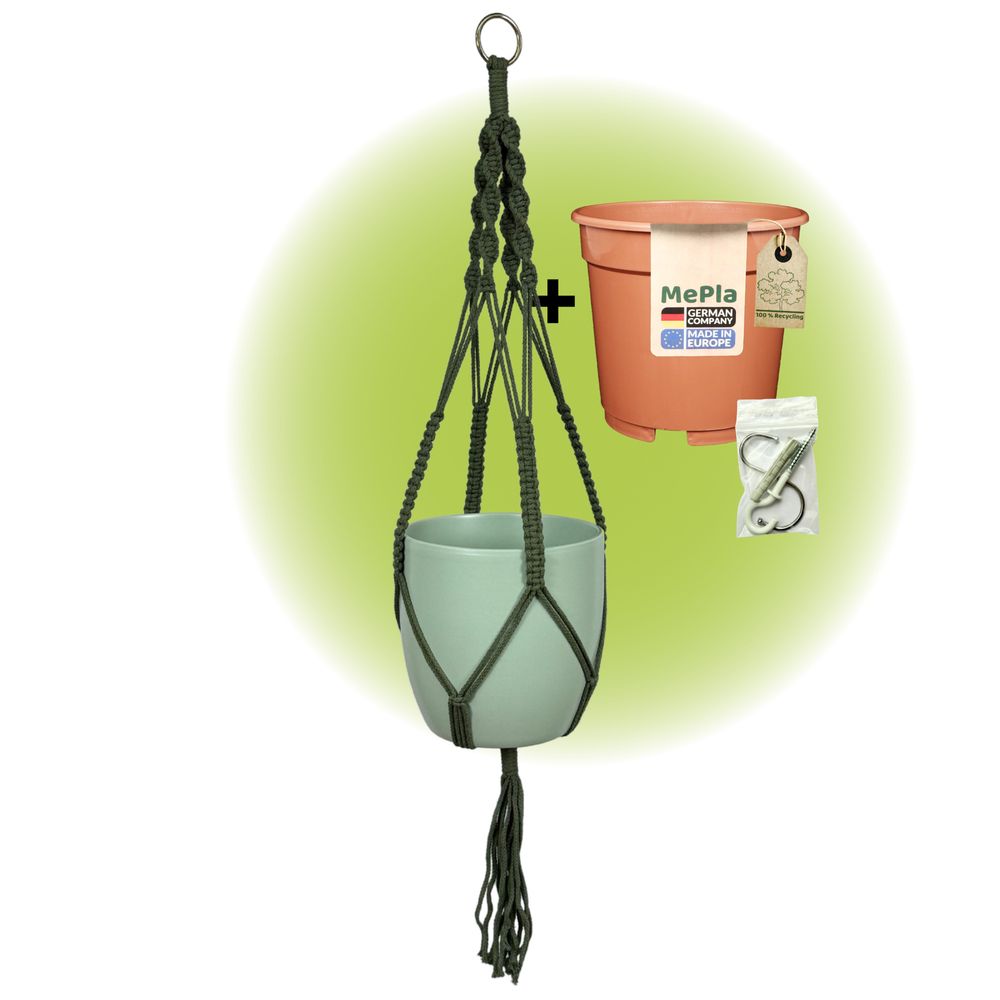 Dieses vielseitige Set aus Keramikübertopf Basel, Kuststoffpflanztopf, passender Hängeampel Makramee und Befestigungsset bringt stilvolle Natürlichkeit und hohe Qualität aus dem Westerwald direkt in Ihr Zuhause.
