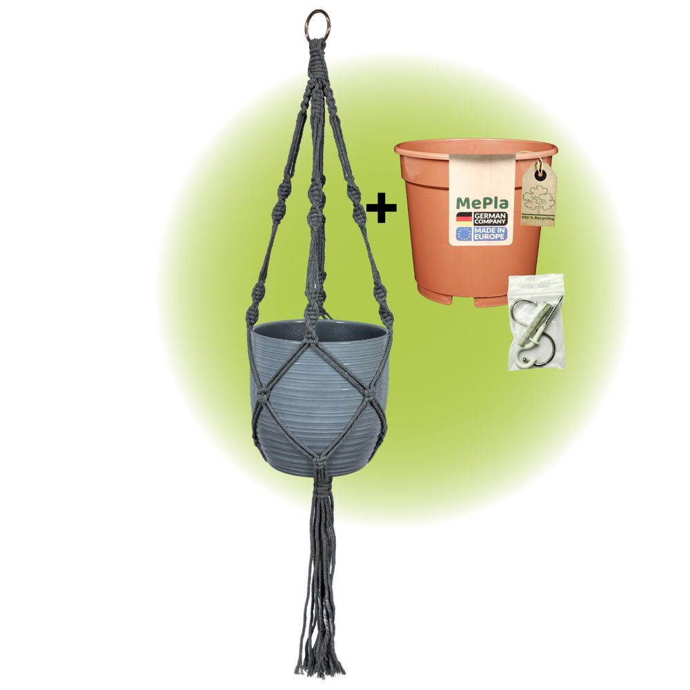 Dieses vielseitige Set aus Keramikübertopf Bergamo, Kuststoffpflanztopf, passender Hängeampel Makramee und Befestigungsset bringt stilvolle Natürlichkeit und hohe Qualität aus dem Westerwald direkt in Ihr Zuhause.