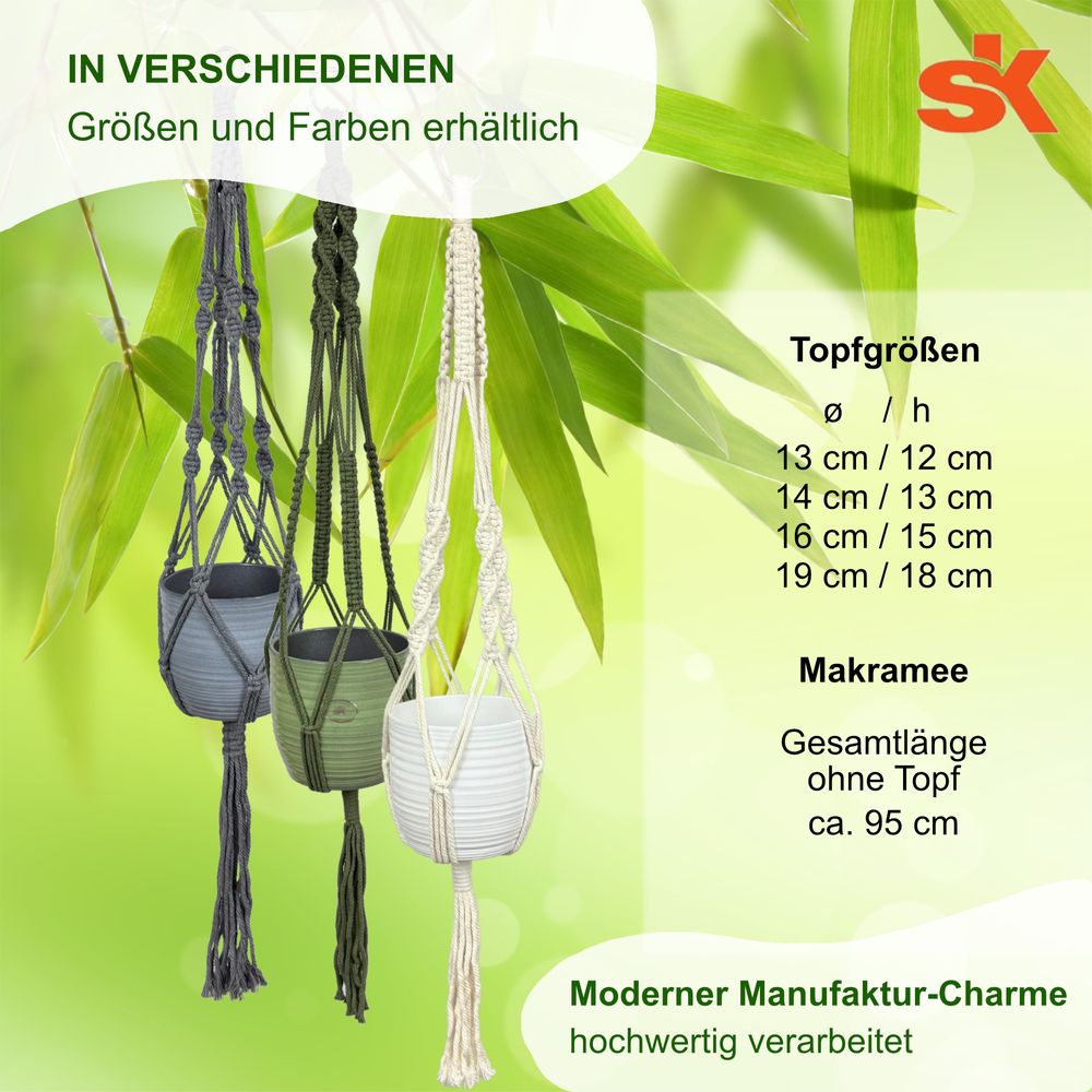 Die farblich abgestimmte Makramee-Hängeampel greift den Trend von Green Living und Vertical Gardening auf und setzt Ihre Pflanzen stilvoll in Szene.