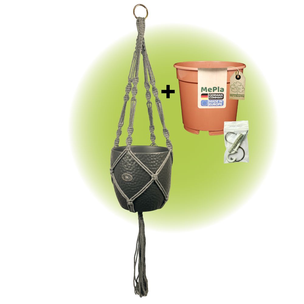 Dieses vielseitige Set aus Keramikübertopf Boston, Kuststoffpflanztopf, passender Hängeampel Makramee und Befestigungsset bringt stilvolle Natürlichkeit und hohe Qualität aus dem Westerwald direkt in Ihr Zuhause.