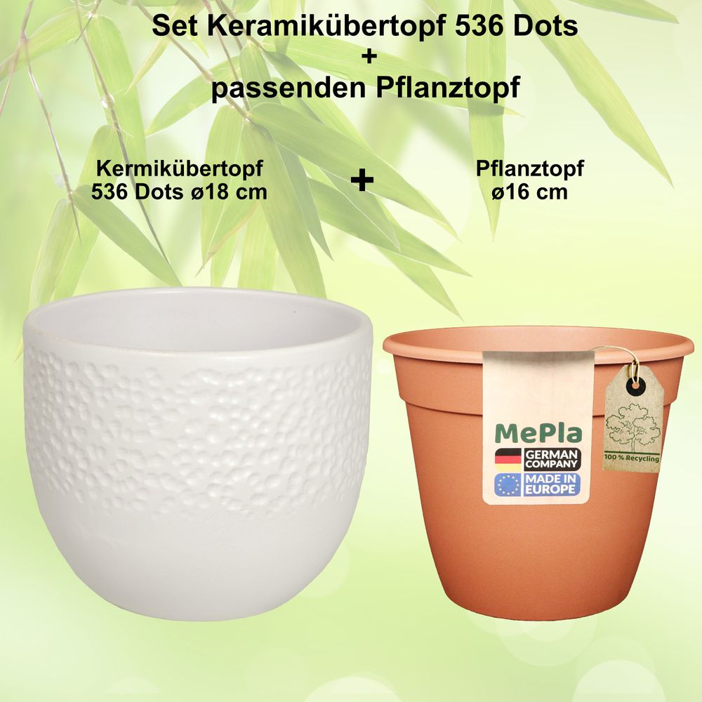 Set bestehend aus dem hochwertigen Keramikübertopf „536 Dots“ der renommierten Firma Gebrüder Spang aus dem Westerwald und einem passenden Kunststoff-Pflanztopf. Der enthaltene Kulturtopf ist mit Bodenlöchern versehen, um Staunässe zuverlässig zu vermeiden – für gesunde Pflanzen und eine stilvolle Präsentation.