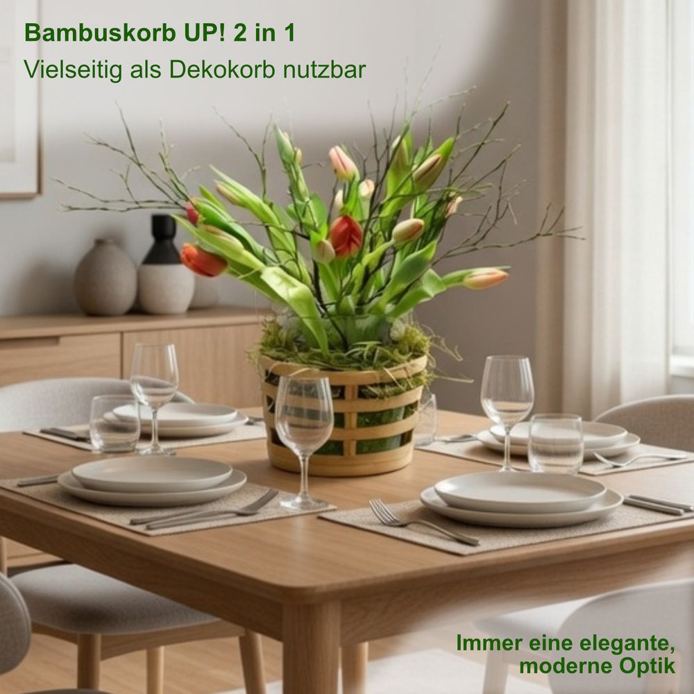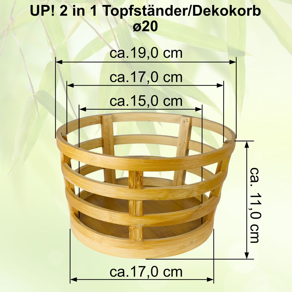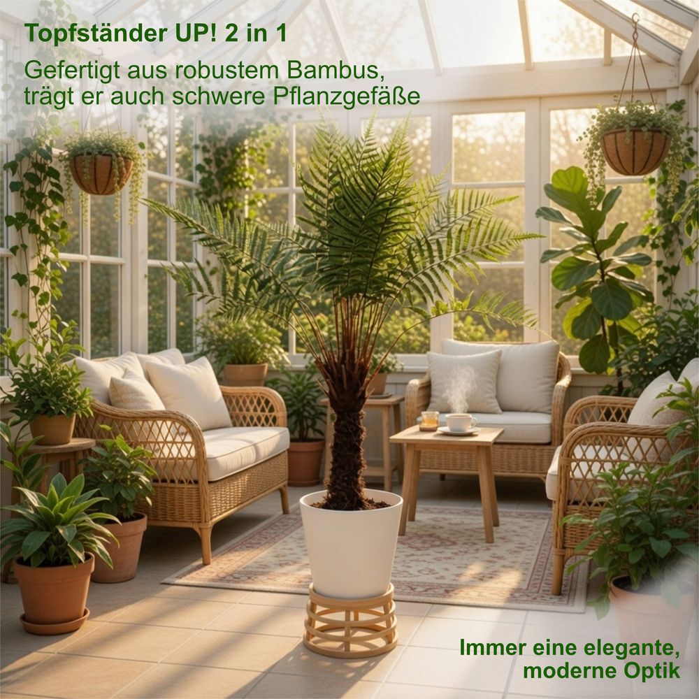 Der MePla UP! 2 in 1 Topfständer / Dekokorb aus Bambus ist die clevere und nachhaltige Lösung für stilvolle Pflanzendekoration. Dank innovativer 2-in-1-Funktion verwandelt er sich im Handumdrehen: Stellen Sie Ihren Übertopf erhöht und elegant auf den stabilen Ständer oder drehen Sie ihn einfach um – schon sitzt der Topf perfekt versenkt für einen cleanen, modernen Look. Hergestellt aus hochwertigem, robustem Bambus trägt er auch schwere Pflanzgefäße absolut sicher und überzeugt durch Langlebigkeit sowie natürliche Optik.