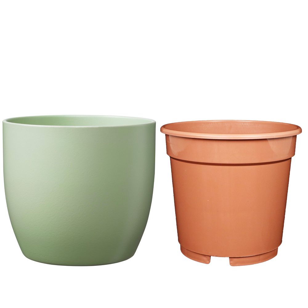Set bestehend aus Keramikübertopf und Kunststoffplatztopf