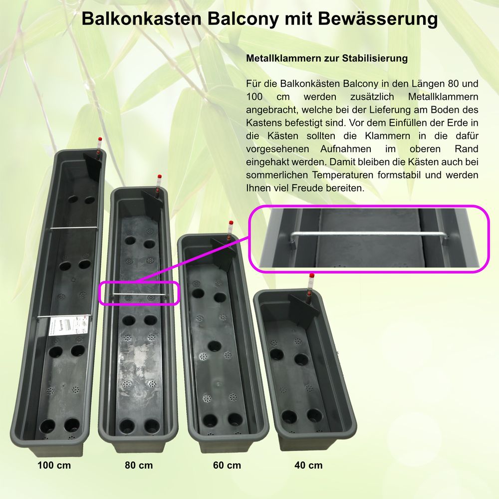 Maße der Balkonkästen (Breite × Höhe): 40 cm | 60 cm | 80 cm | 100 cm – jeweils 16,7 × 13,7 cm