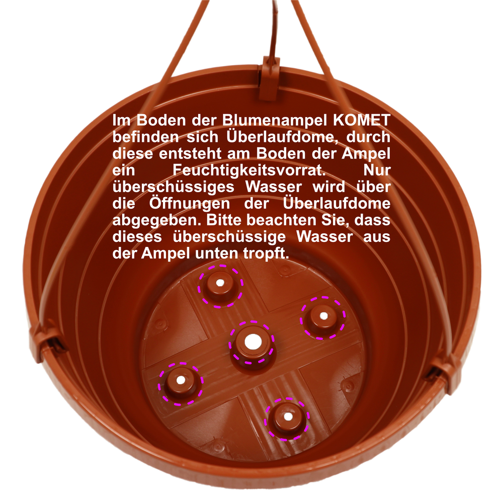 Der durchdachte Wasserauffangmechanismus im Boden der Ampel sorgt für eine optimale Feuchtigkeitsspeicherung. Dank integrierter Überlaufdome wird überschüssiges Wasser zuverlässig abgeführt, während die Pflanze weiterhin mit ausreichend Feuchtigkeit versorgt wird – für gesunde, kräftige Pflanzen ohne Staunässe.