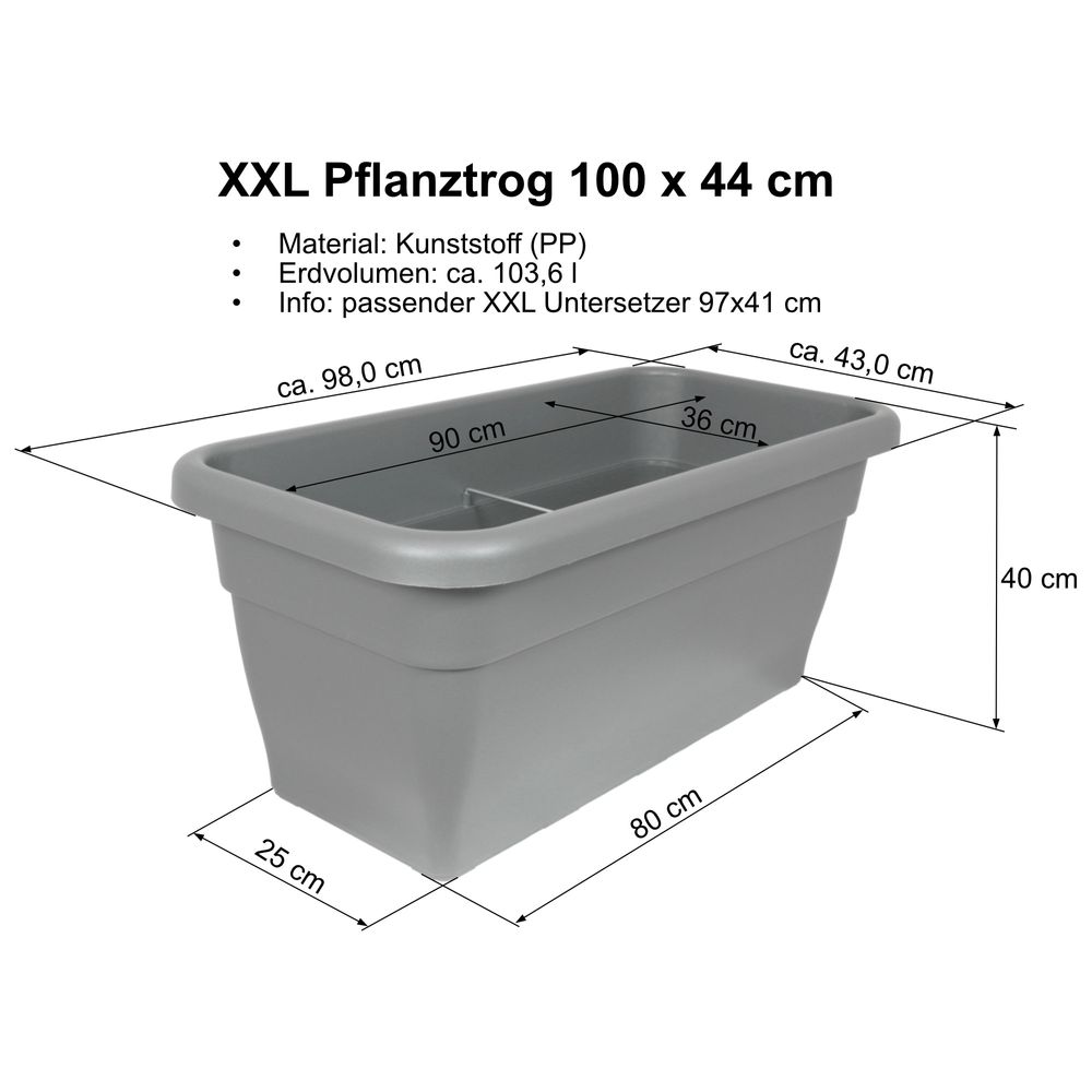 Der Pflanztrog und die Untersetzer werden aus hochwertigem Kunststoff (PP) hergestellt und sind sehr langlebig und stabil. Der Trog kann direkt bepflanzt werden, die notwendigen Entwässerungslöcher sind im Boden schon vorhanden. Das sehr große Erdvolumen bietet Ihren Pflanzen optimale Wachstumsbedingungen. Mit den optional erhältlichen Untersetzern können Sie überschüssiges Gießwasser auffangen und so zusätzliches ein Wasserreservoir für Ihre Pflanzen schaffen. Zur Stabilität der Pflanztröge zu erhöhen, werden ab der Größe 60x30 cm innen Metallklammern eingesetzt.