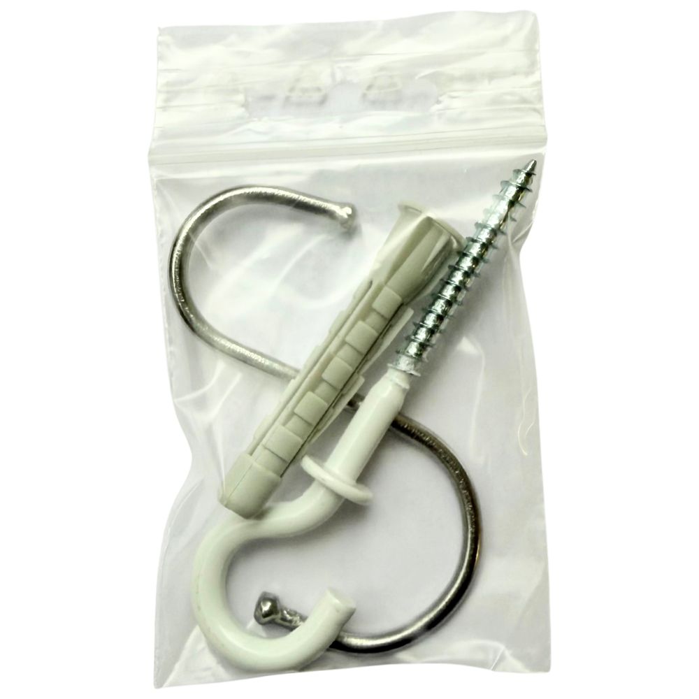 Es besteht aus einem S-Haken (72 x 36 mm), einem Rundhaken (5 x 85 mm, weiß) und einem Super-Universaldübel (Ø 8 mm).